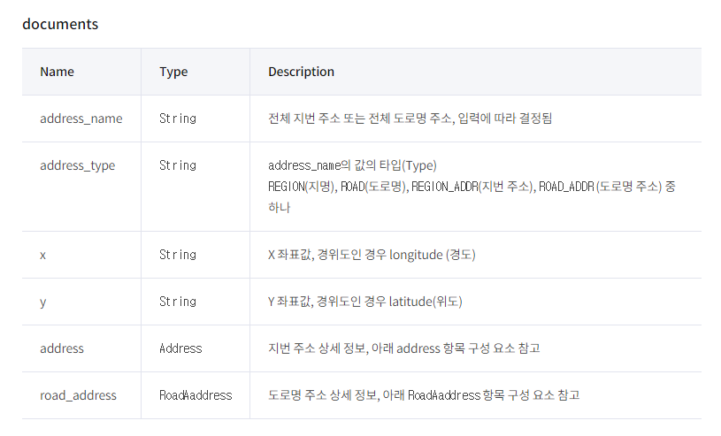 콜백 함수에서 res.data.documents[0]을 통해 주소 정보들을 활용할 수 있습니다.