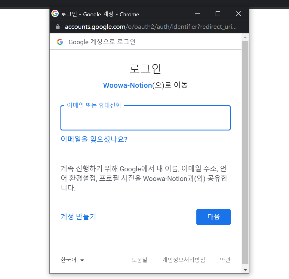 이제 실행시켜보면, 구글 로그인 버튼이 보여지고, 클릭시 팝업창으로 로그인 화면으로 넘어가지는 걸 볼 수 있답니다