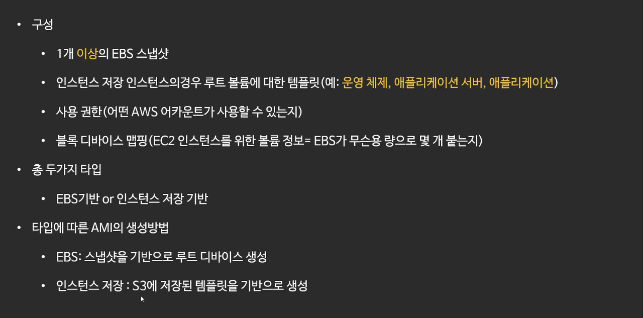 : Elastic Block Storage의 줄임말로 클라우드에서 사용하는 가상 하드디스크 - AMI