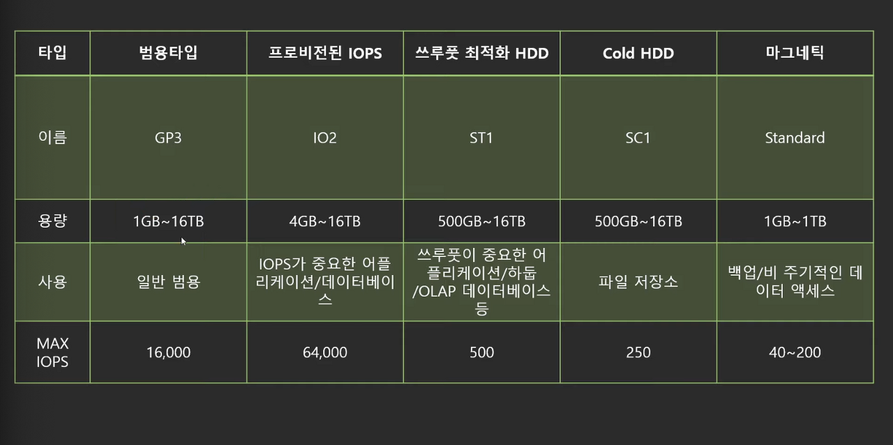 : 클라우드에서 사용하는 가상 서버로 CPU, 메모리, 그래픽카드 등 연산을 위한 하드웨어를 담당 - EBS