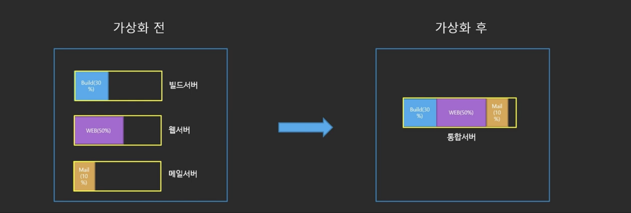컴퓨터 관리자의 입장에서 빌드서버, 웹서버, 메일서버 각각의 컴퓨터의 점유율을 확인해보니 사용하지 않는 잉여자원이 남는다는 것.