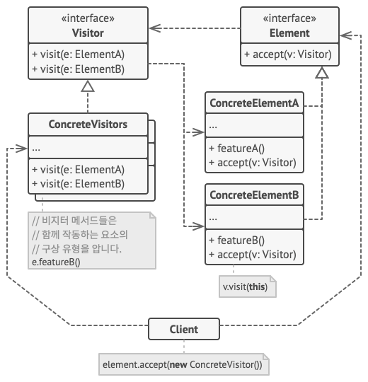 accept메서드에서 Visitor 객체를 호출합니다.class ConcreteElementA implements Element { accept(visitor: Visitor): void { visitor.visitConcreteElementA(this); } }