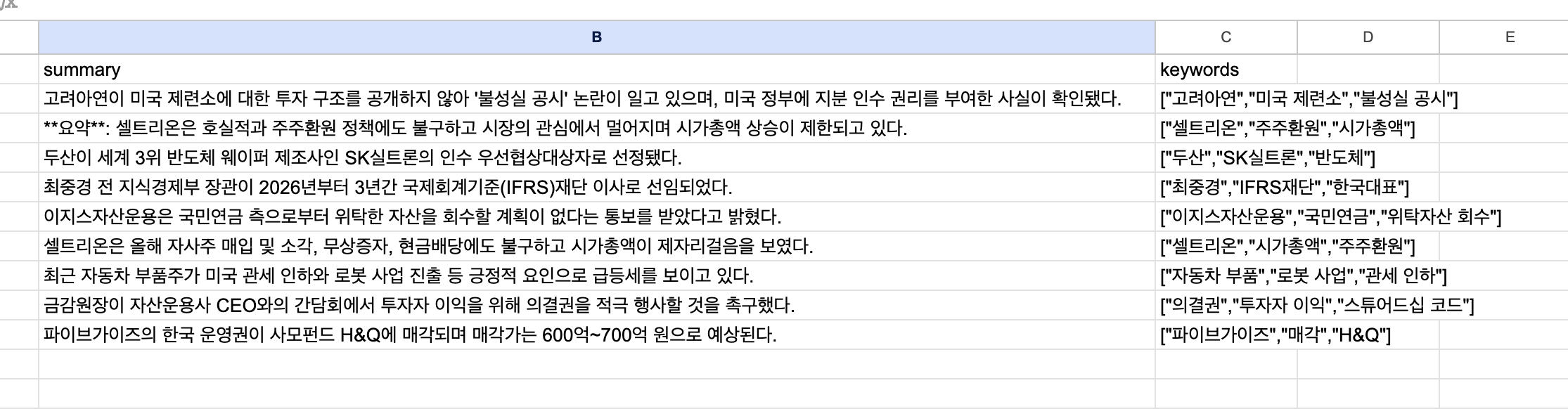 Code 노드를 추가해 summary와 keywords를 따로 포맷팅 했습니다.