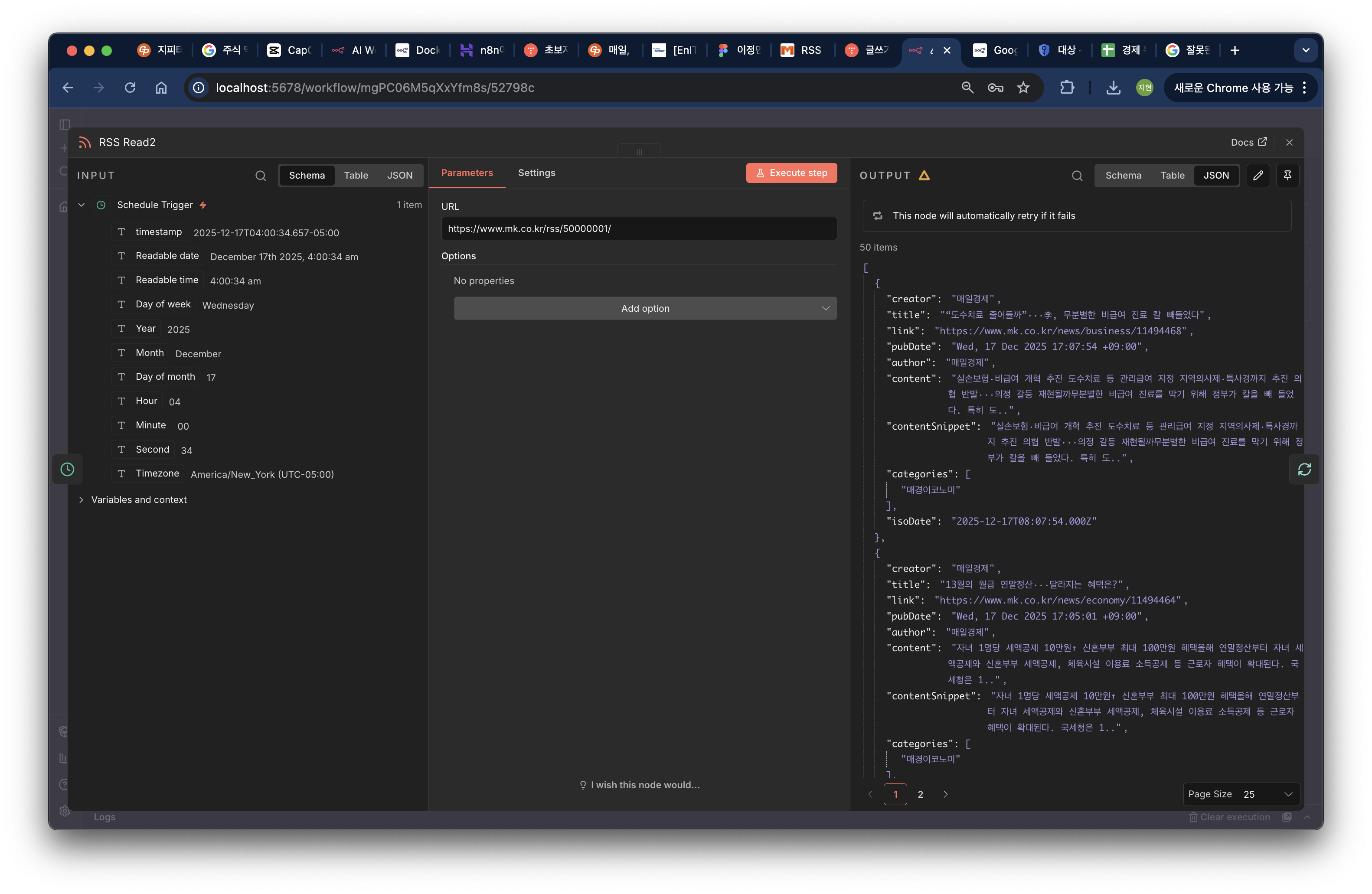n8n에서 제공되는 RSS Read 노드를 추가하고, url을 입력하면 json 형식으로 뽑아줍니다.